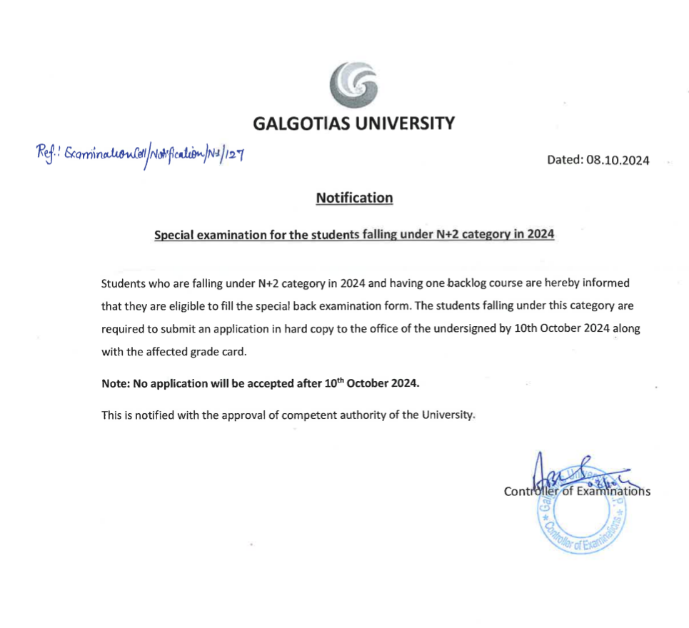 Special examination for the students falling under N+2 category in 2024