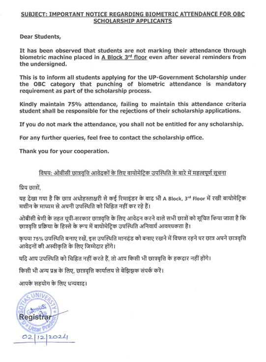 Important Notice Regarding Attendance for OBC Scholarship Applicants for circulation by Admin104 ERP - Monday, 2 December 2024, 3:40 PM Number of replies: 0 Important Notice Regarding Attendance for OBC Scholarship Applicants for circulation Permalink