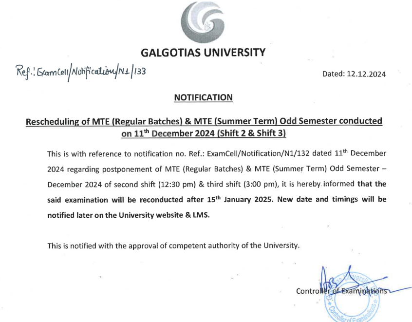Rescheduling of MTE (Regular Batches) & MTE (Summer Term) Odd Semester conducted on 11th December 2024 (Shift 2 & Shift 3)