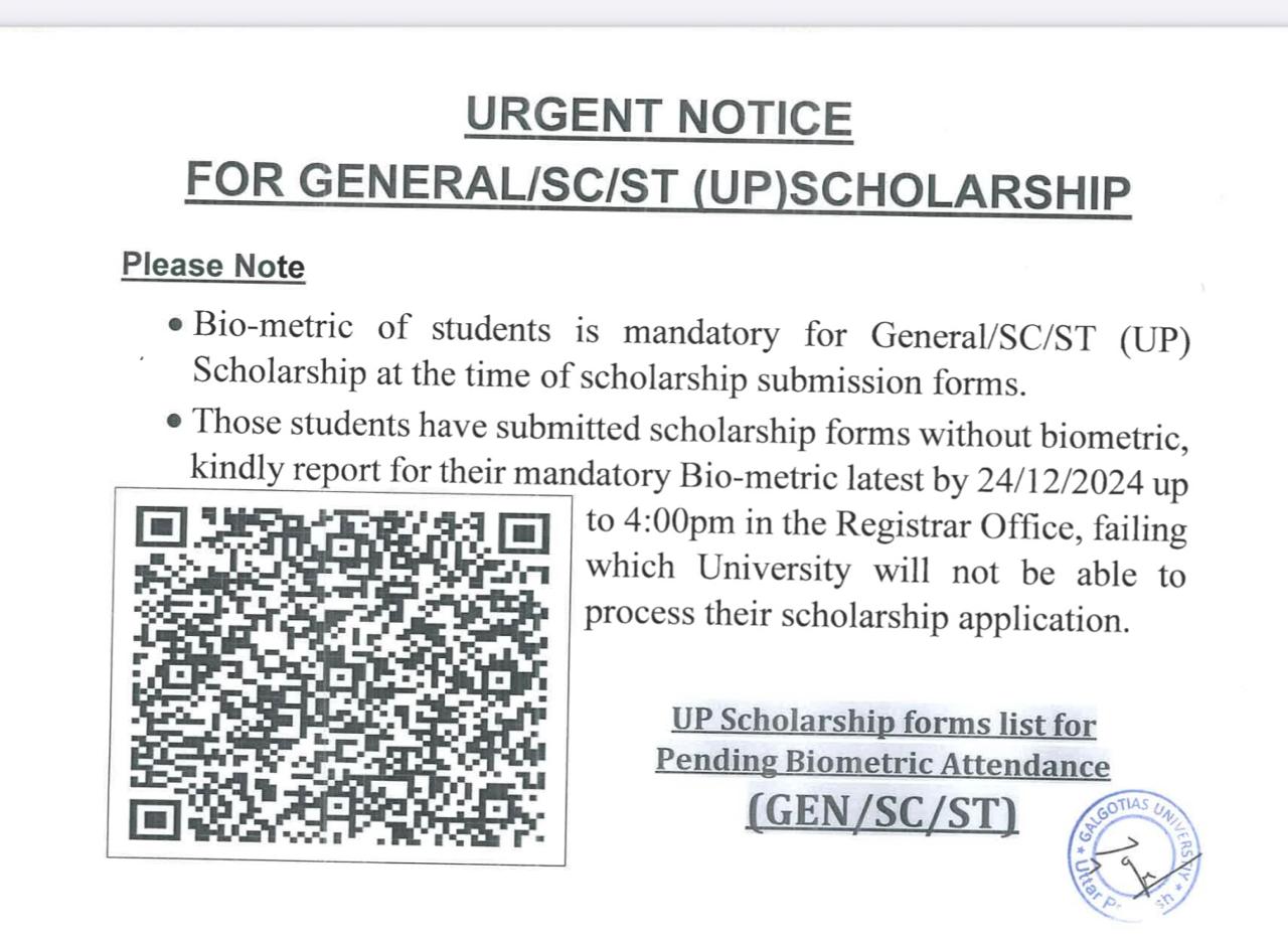 General/SC/ST/UP Scholarship 23/12/2024 by Admin104 ERP - Monday, 23 December 2024, 8:27 PM Number of replies: 0 General/SC/ST/UP Scholarship 23/12/2024 Notice for General SC ST (UP) Scholarship.pdf Permalink